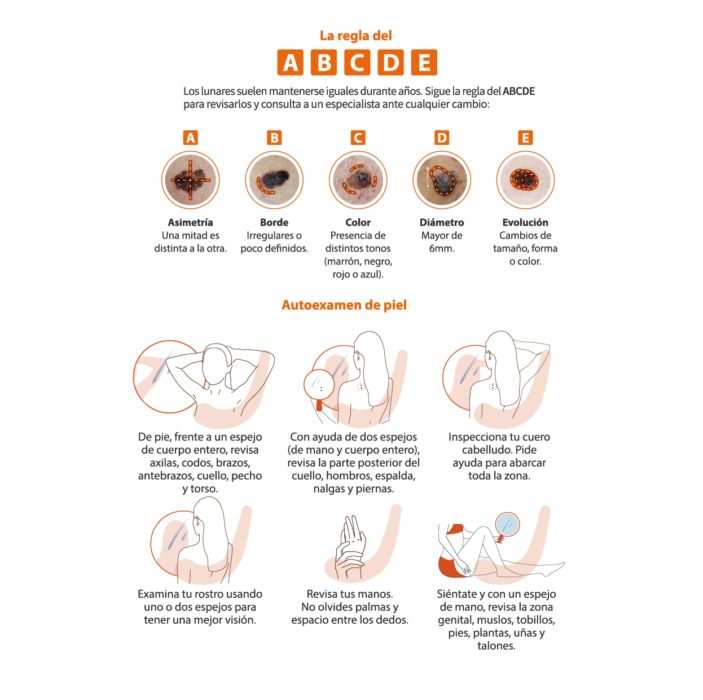 Finalmente, la autoexploración periódica de la piel, como la regla del ABCDE y los controles dermatológicos anuales permiten identificar lesiones sospechosas en etapas tempranas, cuando los tratamientos son más efectivos. La educación y la concientización completan una estrategia preventiva integral que promueve una relación informada, responsable y saludable con el sol.