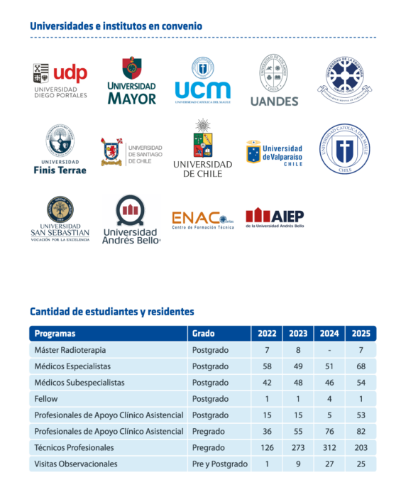 En radioterapia, además, FALP cuenta con una residencia de especialidad que se realiza en conjunto con la Universidad de los Andes, y con un Magíster internacional en técnicas avanzadas de radioterapia desarrollado también junto a esa casa de estudios y auspiciado por la Agencia Internacional de Energía Atómica.