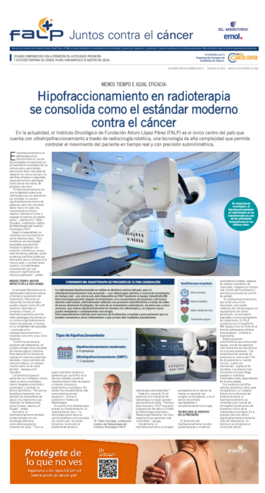 “El ultrahipofraccionamiento, que va de una a cinco fracciones, solo puede realizarse de manera segura con equipamiento de última generación, inmovilización avanzada y control permanente del tratamiento. En FALP contamos con el Cyberknife M6, equipo único en Chile en el área de radioterapia robótica estereotáxica”, enfatiza el especialista.