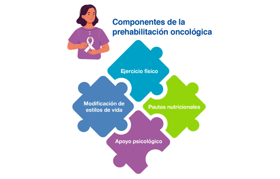 La prehabilitación oncológica se sustenta en una valoración integral que involucra tres pilares: evaluación y soporte nutricional intensivo, ejercicio terapéutico, y apoyo psicológico y conductual.